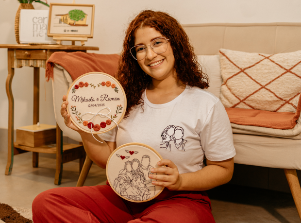 Aqui eu conto histórias através do bordado, seja em retratos, porta alianças, porta maternidade ou bordados criativos. Cada peça é feita com cuidado, intenção e muito empenho!